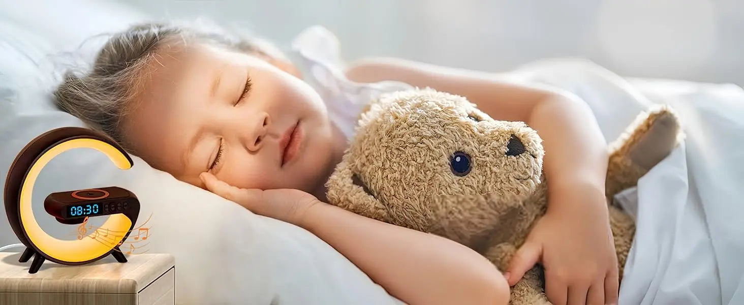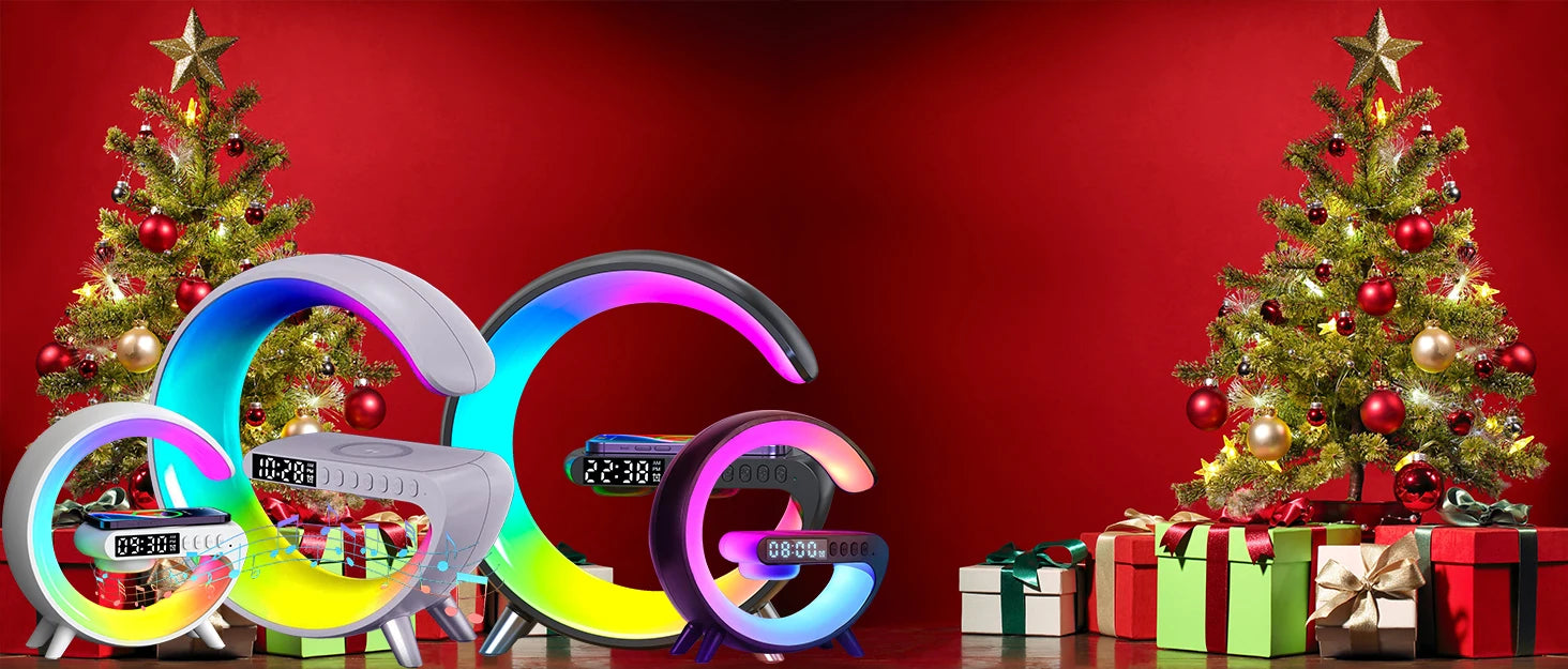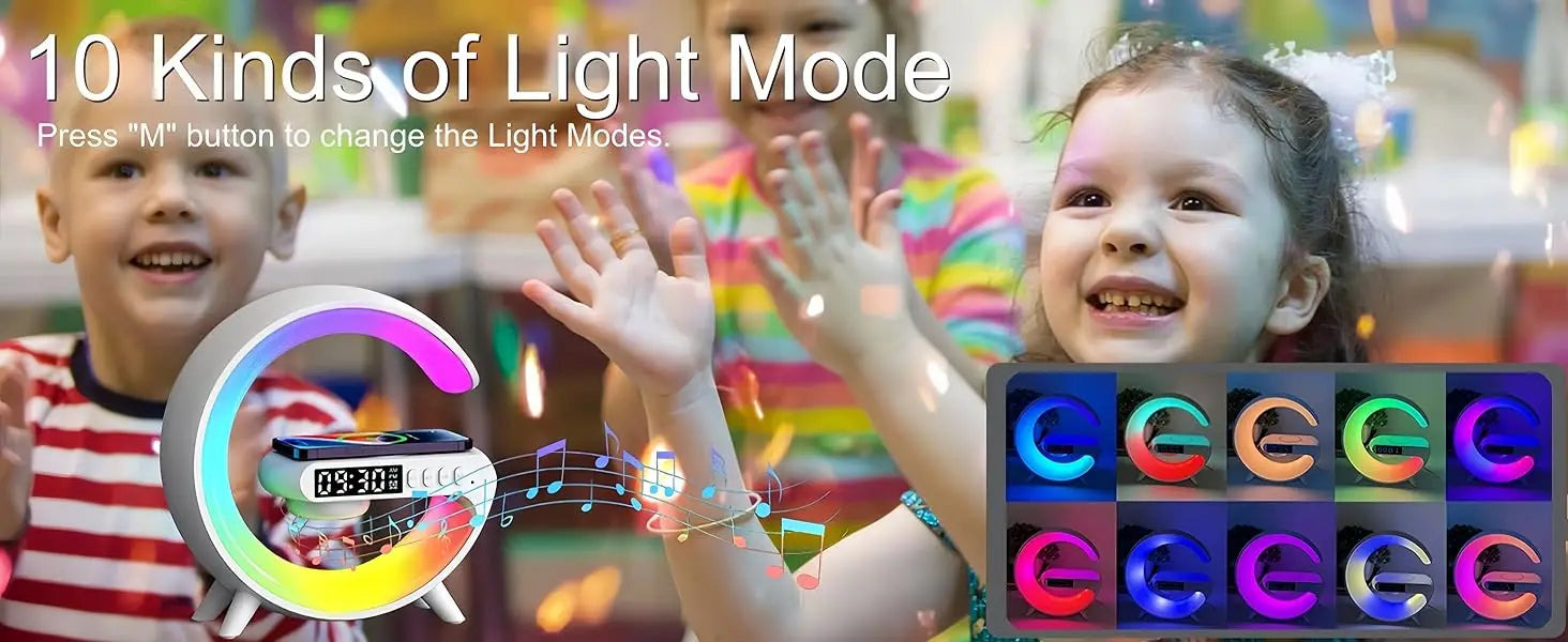 4-in-1 multifunctional design combines wireless charger, Bluetooth speaker, LED lamp, and alarm clock.